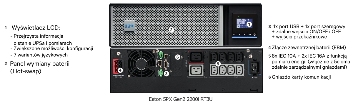 - 5PX Gen 2 leidžia išmatuoti energijos suvartojimą išvesties lizdų grupės lygiu per LCD ekraną ir valdymo kortelę su Eaton Intelligent Power programine įranga.