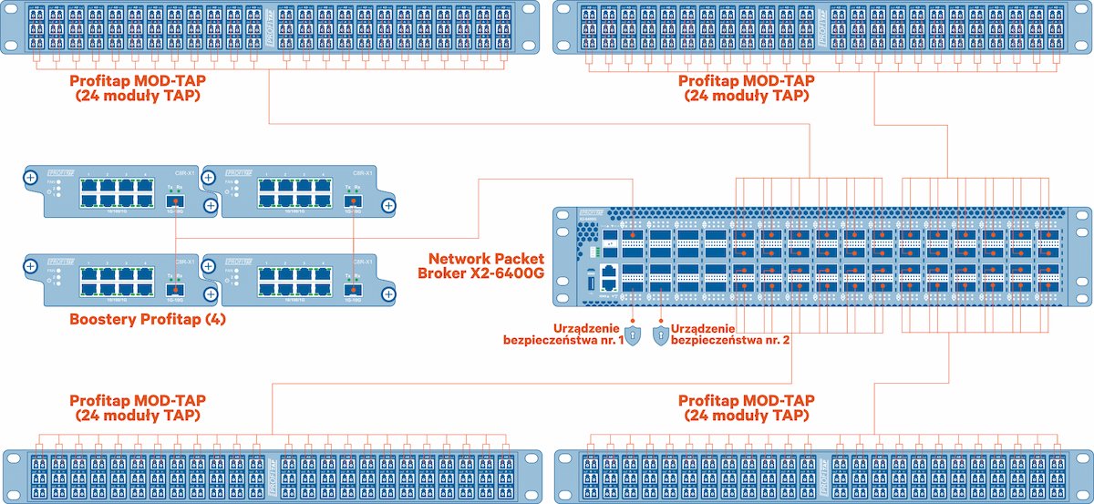 Be to, buvo naudojami „Profitap“ didelio tankio moduliniai TAP, MOD-TAP, teikiantys iki 24 modulių viename MOD-TAP, leidžiantys stebėti iki 96 nuorodų 4U naudojant 4 MOD-TAP. Tai suteikia 192 stebėjimo TAP prievadus, kurie kartu su 100 Gbps prievadais NBP Profitap X2-6400G leidžia išnaudoti visas jų pažangias agregavimo funkcijas. Naudodami 40 Gb/s daugiamodius QSFP+ pertraukimo kabelius, kad prijungtume 10 Gb/s prievadus prie kiekvienos TAP išvesties, prie kiekvieno tinklo paketų brokerio 100 Gb/s prievado galime prijungti po 4 TAP. Didelis MOD-TAP modulinių TAP privalumas yra jų lankstumas maišyti ir derinti skirtingus pluošto tipus toje pačioje važiuoklėje, todėl lengviau tenkinti vietinius serverių kambario reikalavimus.