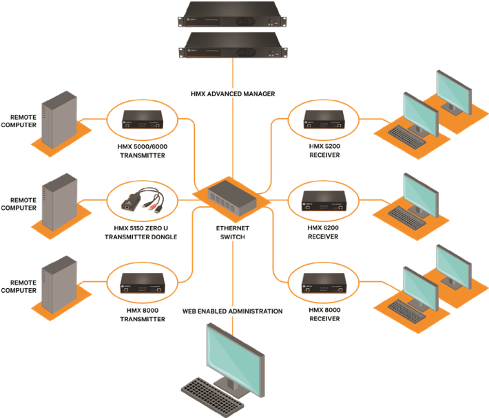 Avocent HMX serija yra rekomenduojamas sprendimas transliuotojams, sporto aikštelėms, postprodukcijai ir daugeliui kitų pramonės šakų, kur reikalinga didelė skiriamoji geba ir nulinis delsos laikas. Su IP palaikymu jungikliai leidžia laisvai įdiegti svarbią aparatinę įrangą saugioje, kontroliuojamoje klimato aplinkoje, toliau nuo vartotojo darbo vietos, išlaikant puikų aptarnavimą. „Avocent HMX5000“ palaiko vaizdo įrašą, kurio didžiausia skiriamoji geba yra 1920 × 1200 px, esant 60 Hz, ir turi integruotą 0 U spinduliuotę, skirtą VGA, DVI-D arba DP. „Avocent HMX6000“ palaiko vaizdo įrašą, kurio maksimali vaizdo įrašo skiriamoji geba yra iki 2560 × 1600 px, esant 60 Hz.