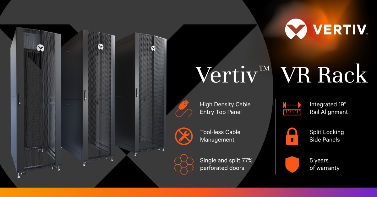 Vienas stelažo standartas visame pasaulyje su Vertiv VR. Vertiv VR stovas tinka įvairiems techninės įrangos sprendimams, įskaitant serverius, saugojimo įrenginius, jungiklius, maršrutizatorius, PDU, UPS, konsolinius serverius ir KVM jungiklius. Vertiv VR spinta yra paruošta didelio tankio aplinkoms, kad atitiktų svarbiausius verslo poreikius – net ir jiems keičiantis. Spintelė suteikia lankstumo dėl paprastos tvirtinimo sistemos.
