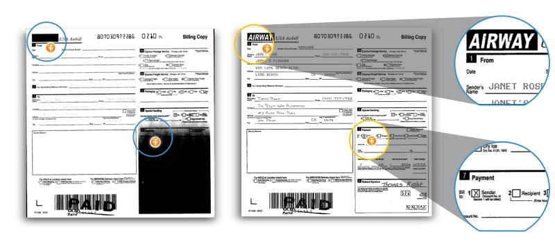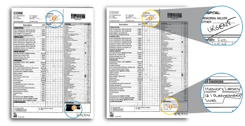 Taikant tradicinį nuskaitymą, pieštuku padarytos pastabos yra neįskaitomos, o apbrauktas tekstas paverčiamas tamsiais elementais. Teksto negalima perskaityti. Programoje Kofax Express pieštuko raštas yra patamsėjęs. Programa atpažįsta žymeklius ir pašalina nereikalingą foną. Dėl to pieštuku parašytas arba ryškiomis spalvomis apvestas užrašas yra įskaitomas.