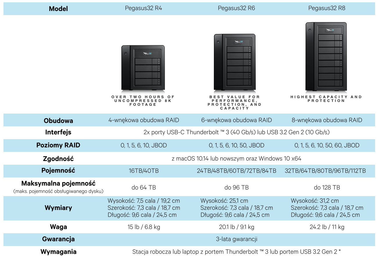 Turėdami 4, 6 arba 8 standžiųjų diskų korpusus, diskų konfigūraciją nuo 12 TB iki 112 TB, turime saugojimo sprendimą, atitinkantį kiekvieno vartotojo poreikius. Reikia daugiau greičio – tinkinkite RAID nustatymus. „Pegasus32“ serija palaiko RAID 0, 1, 5, 6, 10, 50, 60 ir JBOD, priklausomai nuo modelio.