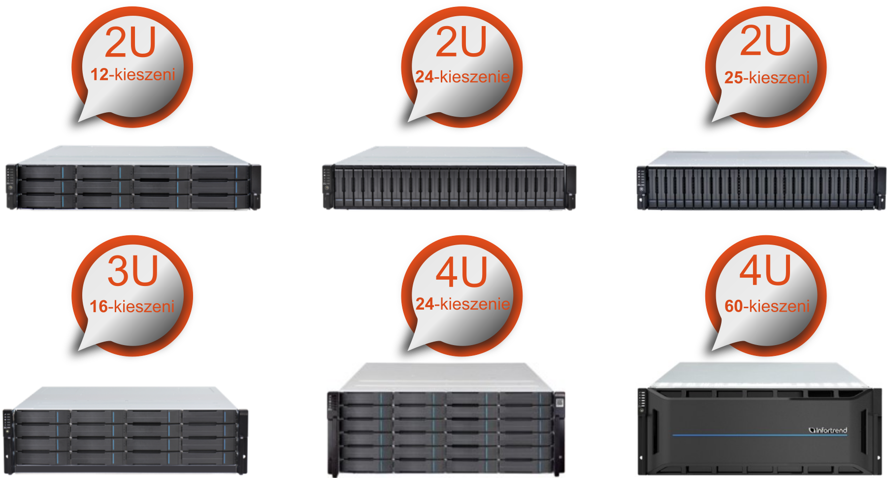 „Infortrend“ siūlo masyvo korpusus ir išplečiamus lentynų korpusus, pvz., 2U12, 2U24, 2U25, 3U16, 4U24, 4U60 skyrių ir kt. Juos galite rinktis net iš tos pačios serijos. sprendimą, kuris geriausiai atitinka dabartinius ar būsimus poreikius.