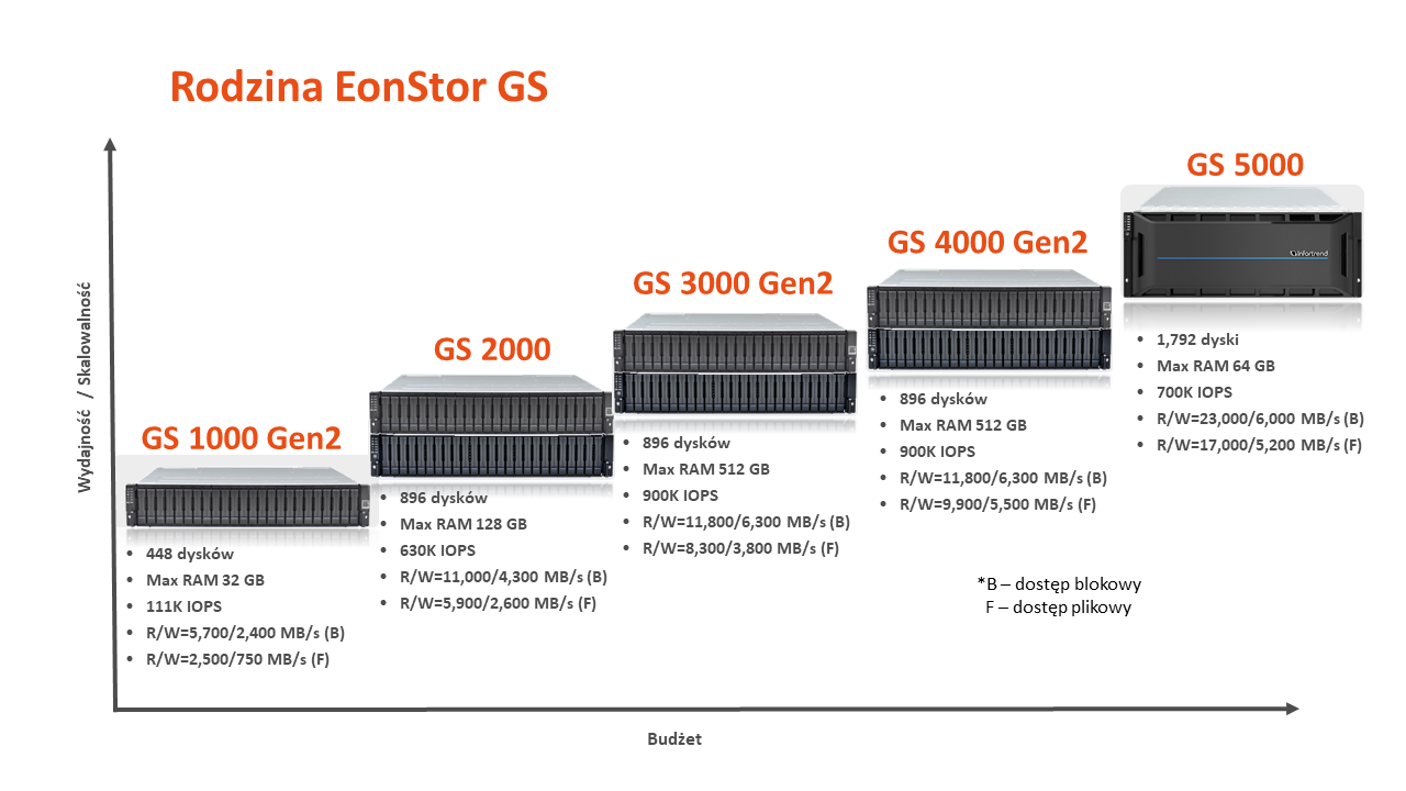 „EonStor GS 5000 / 4000“ serija yra didelio našumo įmonės sprendimo pagrindas, siūlantis lankstumą ir galimybę efektyviai padidinti našumą visoje įmonėje. Jie gali apdoroti didelius įvesties / išvesties ir failų perdavimo kiekius, net esant dideliems darbo krūviams, ir puikiai tinka hibridinėms aplinkoms, kuriose integruota SAN, NAS ir debesis. GS 5000 puikiai tinka tiems, kurie ieško itin didelio našumo, talpos ir daugybės sąsajų prievadų. Kita vertus, GS 4000 yra skirtas įmonėms, turinčioms mažesnį biudžetą, tačiau vis tiek gali patenkinti visus saugojimo poreikius.