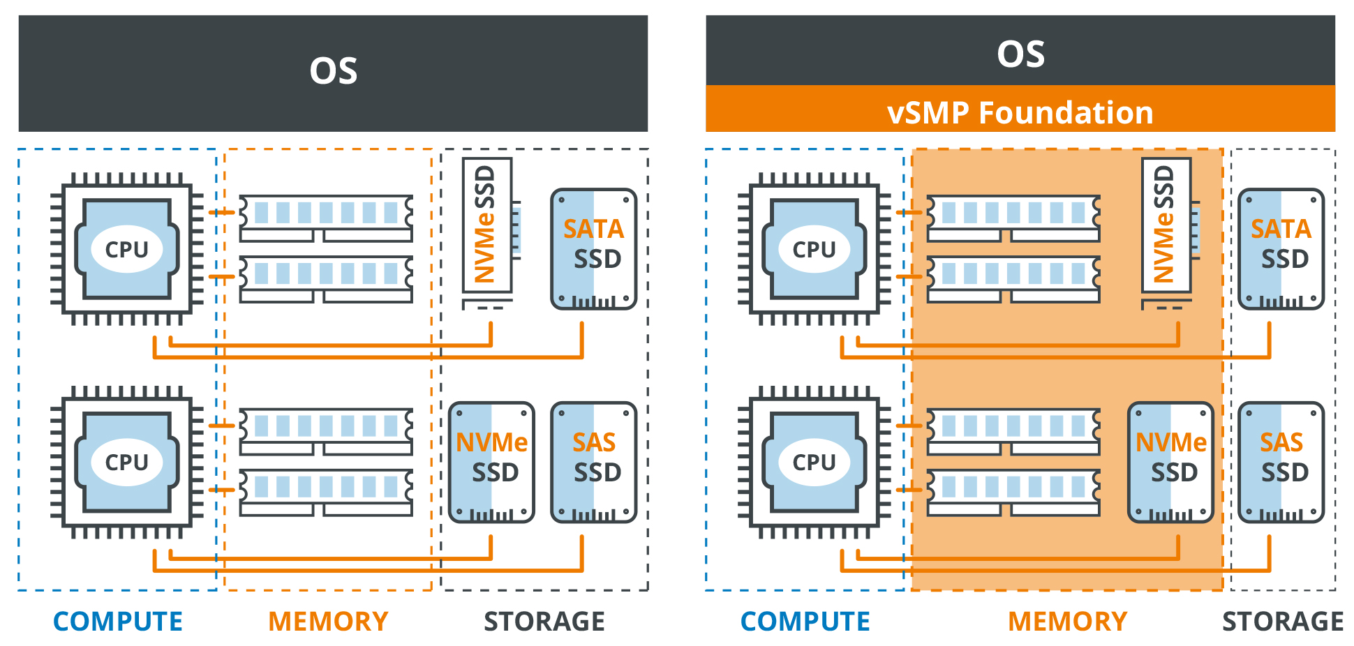 vSMP MemoryONE praplečia standartinių x86 sistemų RAM, naudodama NVMe SSD. Dėl to jis leidžia daug ekonomiškiau naudoti didesnę RAM, išlaikant į DRAM panašų našumą.