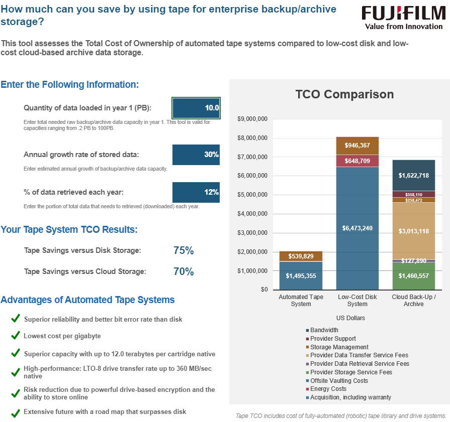 Nemokamas internetinis įrankis, kurį sukūrė saugojimo ekonomikos ekspertas Brad Johns Consulting ir remia Fujifilm, apskaičiuoja 5 ir 10 metų bendrus scenarijus.
